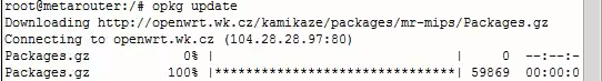 سپس با دستور opkg update اقدام به بروزرسانی پکیج های OpenWRT می نماییم. توجه داشته باشید که می بایست به اینترنت متصل باشید.