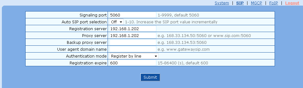 مطابق تصویر از سریرگ سیپ در سربرگ Basic، پورت ۵۰۶۰ را وارد کرده، و در قسمت Registration server و Proxy server آی پی دستگاه مقصد (گوشی تلفن، ATA و … ) را وارد میکنیم.