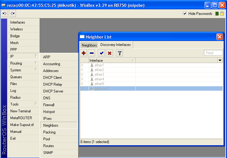 برای حل این مشکل می بایست Neighbors Discovery را در میکروتیک غیر فعال کنید،برای این منظور در Winbox مطابق شکل به IP >> Neighbors بروید و در تب Discovery interfaces هر اینترفیس که نمی خواهید میکروتیک شما از آن طریق دیده شود را غیر فعال کنید.